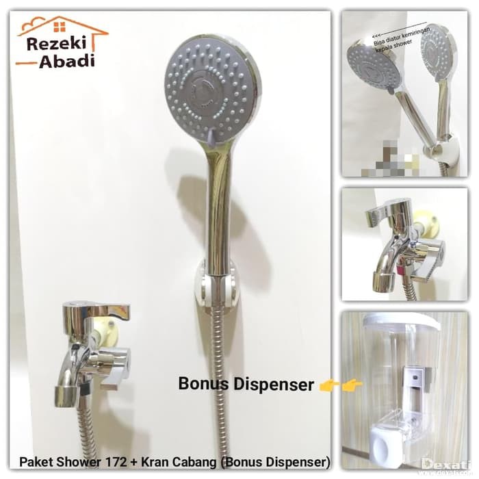 Bonus Dispenser / Handshower / Paket Shower Mandi 4 Sistem / Kran Cabang~ 1 paket termasuk : ~ 1pcs kran cabang model engkol (uk. 1/2") bahan babet~ 1pcs hand shower 3 sistem (included : hanger shower, selang shower 1,5 mtr, baut dan fisher)~ Bahan shower dari plastik abs~ Hanger bisa diatur kemiringan kepala shower ~ Finishing chrom mulus ~ Bonus 1 pcs dispenser single 250ml barang tersedia boss , langsung dipesan , akan segera kami p