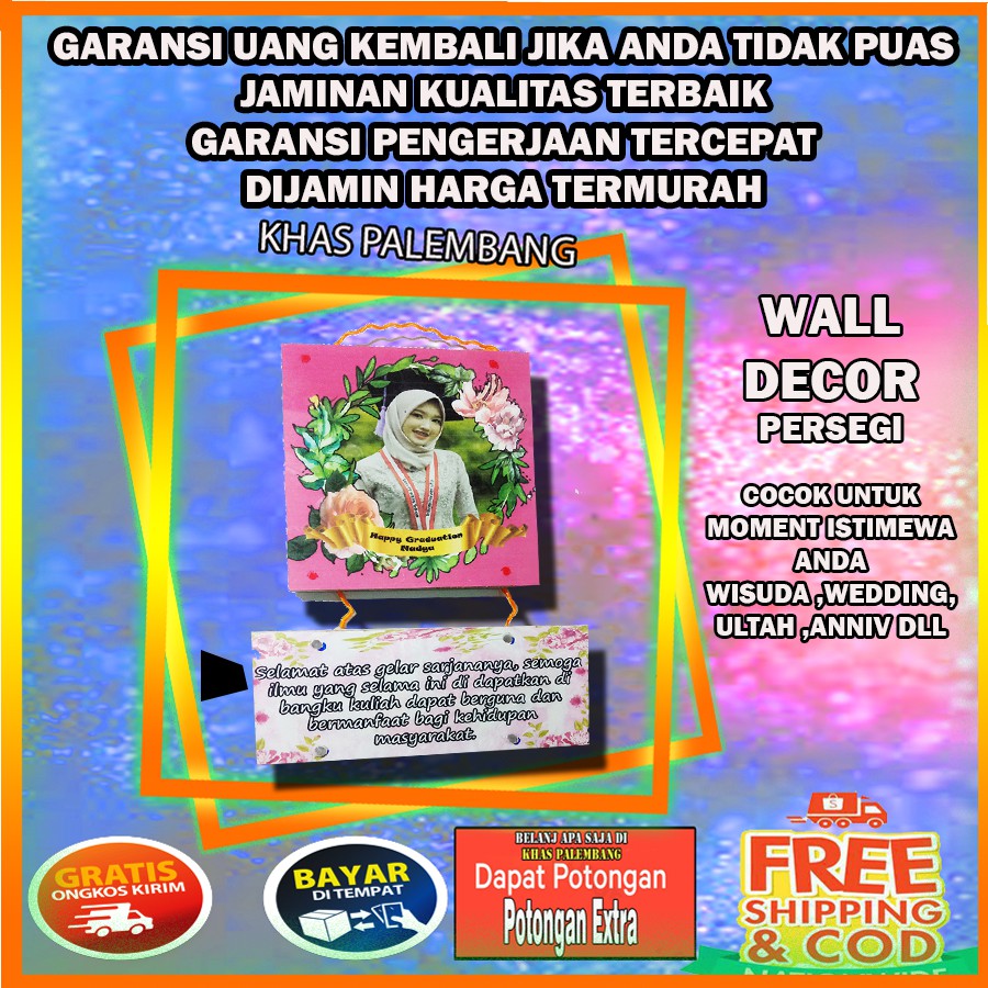 Pajangan dinding desain customMau pajangan rumah yang bisa desain custom ? bisa pakai kata kata sendiri ? bisa pakai foto ?Pajangan dinding jadi rekomendasi untuk andaPajangan dinding kami cocok untuk pajangan kamar tidur, kamar anak, petunjuk toilet bahkan souvenir untuk moment moment kantor dan moment lainnya.deskripsi produk- UKURAN 15 x 15- full kayu (anti pecah)- bahan anti air ( tidak luntur)- hasil cetak tidak pudar (tahan puluhan tahun)- hasil cetak sudah dilaminating- hasil lebih berkualitas- MURAH BERKUALITASkeunggulan kami- produk desain custom- pengerjaan cepat- full handmade, desain tidak sama- cocok untuk pajangan rumah- petunjuk ruangan- kado dan souvenir murah- MURAH BERKUALITASJADIKAN KAMI " KHAS PALEMBANG " Sebagai toko favoritmu agar bisa mendapatakan info info produk dan promo promo dari toko kamiPRODUK LAINNYAsale mozaik art frame ( cetak foto gift ulang tahun wedding wisuda anak HIASAN DNDING HIASAN DIGITALhttps://shopee.co.id/sale-mozaik-art-frame-(-cetak-foto-gift-ulang-tahun-wedding-wisuda-anak-HIASAN-DNDING-HIASAN-DIGITAL-i.69868627.2332670186ART FRAME 10R ( HIASAN DINDING KAMAR TIDUR WALPAPER KALIGRAFI VINTAGE ) PROMO FRAME HIASAN DINDINGhttps://shopee.co.id/ART-FRAME-10R-(-HIASAN-DINDING-KAMAR-TIDUR-WALPAPER-KALIGRAFI-VINTAGE-)-PROMO-FRAME-HIASAN-DINDING-i.69868627.2332655988PROMO MOZAIK 10R FRAME + JAM ( SOUVENIR PAJANGAN HIASAN DINDING CUSTOM KADO WEDDING ULTAH )https://shopee.co.id/PROMO-MOZAIK-10R-FRAME-JAM-(-SOUVENIR-PAJANGAN-HIASAN-DINDING-CUSTOM-KADO-WEDDING-ULTAH-)-i.69868627.2332641434SCRAP FRAME PO UP ( HIASAN DINDING CUSTOM TERMURAH DESAIN KALIGRAFI WEDDING TERMURAHhttps://shopee.co.id/SCRAP-FRAME-PO-UP-(-HIASAN-DINDING-CUSTOM-TERMURAH-DESAIN-KALIGRAFI-WEDDING-TERMURAH-i.69868627.232477