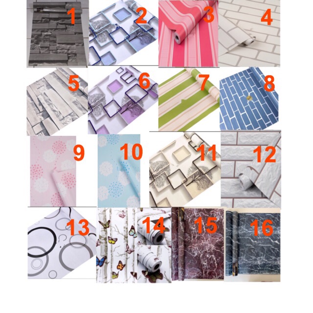 SILAHKAN TULIS MOTIF PILIHAN DI KETERANGANWALLPAPER STICKER / WALLPAPER DINDING STICKERSUDAH ADA LEMNYAMUDAH DIPASANG SENDIRIPRAKTIS DAN MUDAH dalam pemasangan.Bahan : bertexture, ANTI AIR, ANTI LEMBAB, ANTI JAMUR , Non transparantSudah ada Lemnya,langsung tempel,MUDAH DIPASANG SENDIRI.TAHAN sampai 2-5 tahun pada dinding yang sehat (tidak berpasir, tidak terjemur,tidak lembab)Ukuran :1roll 45cm x 10 meter (ukuran area 4,5 meter persegi)CARA UKUR BUTUH BELI BERAPA ROLL:LEBAR DINDING X TINGGI DINDING KEMUDIAN DIBAGI 4,5Contoh: Lebar dinding 3meter, tinggi 3meter, jadi 3X3=9 DIBAGI 4,5 = 2ROLL(45cm x 10m)jadi, Beli 2roll saja Tips : Lap basah terlebih dahulu pada bidang yang ingin ditempel agar bebas debu, tunggu sampai kering, dijamin akan melekat kuat.WALLPAPER JENIS INI BISA JUGA DIPAKAI UNTUK BERKREASI MEMPERCANTIK TAMPILAN MEJA, KOMPOR/KITCHEN SET, KULKAS, LEMARI, MEJA BELAJAR, KAMAR MANDI, DLL.Stok terbatas, silahkan sebelum kehabisan.Terima Kasi