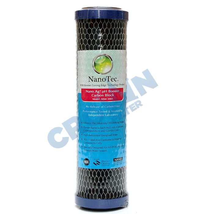 Nano Ag+ PH Booster Carbon Block merk Nanotech (NSM 300A)Fungsi :-.Meningkatkan alkalinitas air minum.-.Menghilangkan bakteri seperti E.coli, Coliform, Cryptosporidium.-.Merubah air menjadi air energi berantioksidan tinggi.Dirancang khusus untuk Sistem Air Reverse Osmosis.Penggunaan pada housing 10".Penjelasan mengenai Ag+ :Ion Perak Ag+ atau Ion Silver adalah air tanpa bau, tawar, tidak berbahaya untuk mata, tidak ada radikal bebas, tidak berbahaya untuk manusia dan tidak memiliki reaksi dengan obat lainnya. Ion perak meningkatkan pencernaan, bantuan dalam regenerasi sel yang rusak dan sel-sel, membantu mencegah demam, flu dan penyakit yang disebabkan organisme baik bakteri, jamur,parasit dan virus. Ion Perak ag+ membunuh dan melawan Virus, Bakteri, Parasit, Jamur hingga 650 jenis.Partikel Ion Perak ag+ di kembangkan oleh NASA sebagai Suplement untuk menjaga kesehatan Astronot saat berada di Luar Angkasa Kini Ion Perak dikembangkan di Indonesia menggunakan Nano Teknologi dari JermanION PERAK ag+ yang aman bagi wanita hamil, perawatan dan kesembuhan terhadap penyakit , bahkan janin dalam pertumbuhan dan kesehatan.Khasiat/Manfaat/Fungsi utama Ion Perak Ag+ :1.Untuk menghancurkan infeksi dan penyembuhan diri.2.Untuk Mengaktifkan sel yang rusak dan menjadikan sel meregenerasi sel baru yang bagus (untuk mulai dari feats regenerasi).3.Tidak mengandung radikal bebas, aman untuk enzim tubuh manusia dan tidak ada efek samping yang negatif jika digunakan bersamaan dengan obat, jamu, atau suplemen lainnya.4.Membantu memperbaiki pencernaan, regenerasi sel dan jaringan yang rusak, mencegah pilek dan flu, alergi dan berbagai penyakit yang disebabkan berbagai jenis bakteri, kuman dan infeksi virus.5.Non-Toxic dan tidak berbahaya terhadap ginjal, hati, mata, dan organ tubuh lainnya.6.Bila digunakan setiap hari secara teratur dapat membantu meningkatkan sistem kekebalan tub barang tersedia boss , langsung dipesan , akan segera kami p