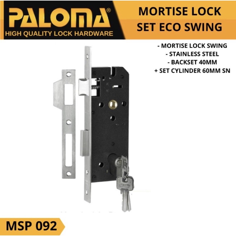 Product Description : MORTISE LOCK SET PALOMA STANDARD SWING 40MM + CYLINDERKeterangan Body Kunci MLP 092 :- Medium duty mortise lock.- For moderate frequency of use such as for doors in residential properties.- Suitable for wooden door mass up to 100kg.- 5 Years Mechanical Warranty.- Designed according to European standards.Backset : 40mm.Mechanical : Medium duty internal mechanism.Latchbolt : Steel. Reversible. Cylinder activated.Deadbolt : Steel . Double throw.Faceplate : Steel.Strikeplate : Steel. Strikebox included.Casing : Steel, painted. Closed case.Spindle Hub : Steel. Square shaped.Keterangan Cylinder Kunci CLP 104 :- Medium duty, for moderate frequency of use such as for doors in residential buildings.- Galvanized body, rust and corrosion resistant.- Standard key on both sides.- 5 Years Mechanical Warranty.- Designed according to European standards.Shell & Plug : Zamak-3.Pin : Brass, 5 pins.Cam : Hardened steel.Key : Brass standard-key, nickel plated. 3 keys included.Harga Tertera Adalah Harga Per