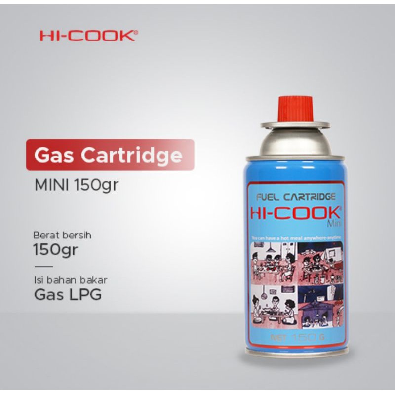 HI-COOK gas cartridge 150 Gr mini inihanya untuk digunakan pada kompor portable tipe KC 001 KC 108, KC 109 dan KC 301.Spesifikasi teknis:Berat bersih: 150 gBerat kotor: 250 gIsi: L.P GasLama pakai : tergantung pemakaianBox: 28 pcs